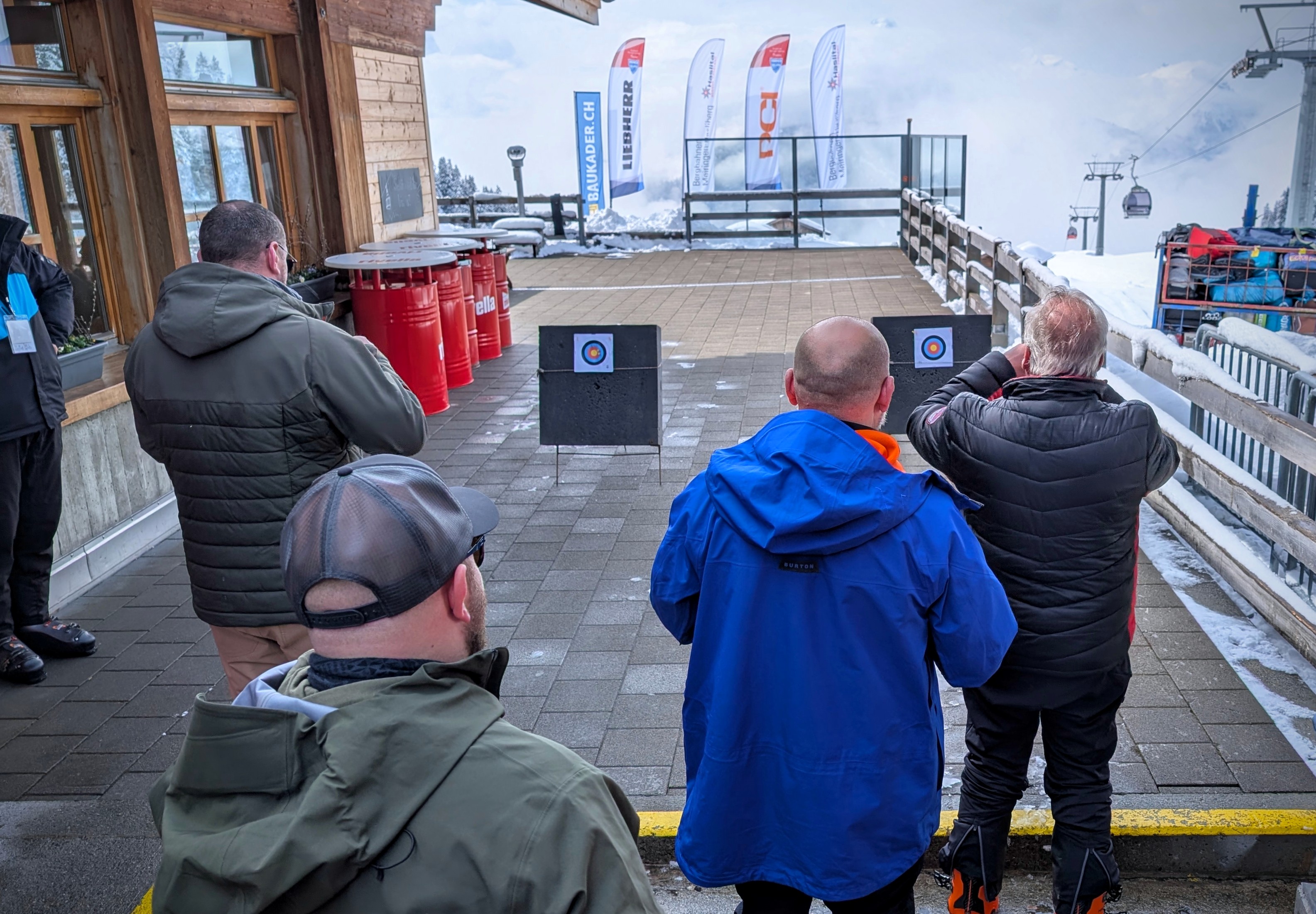 Zudem war der verstärkt aufkommende Nebel kein Problem für die ab 11 Uhr startende, von Baukader Schweiz präsentierte Plausch-Olympiade. Denn die Teams massen sich vor und nach dem Mittagessen in den Disziplinen Schnee-Golf, Blasrohrschiessen, Cornhole-Werfen und Skigebiet-Quiz. Unter der Aufsicht von Baukader Schweiz lieferten sich 15 Teams ein Kräftemessen.