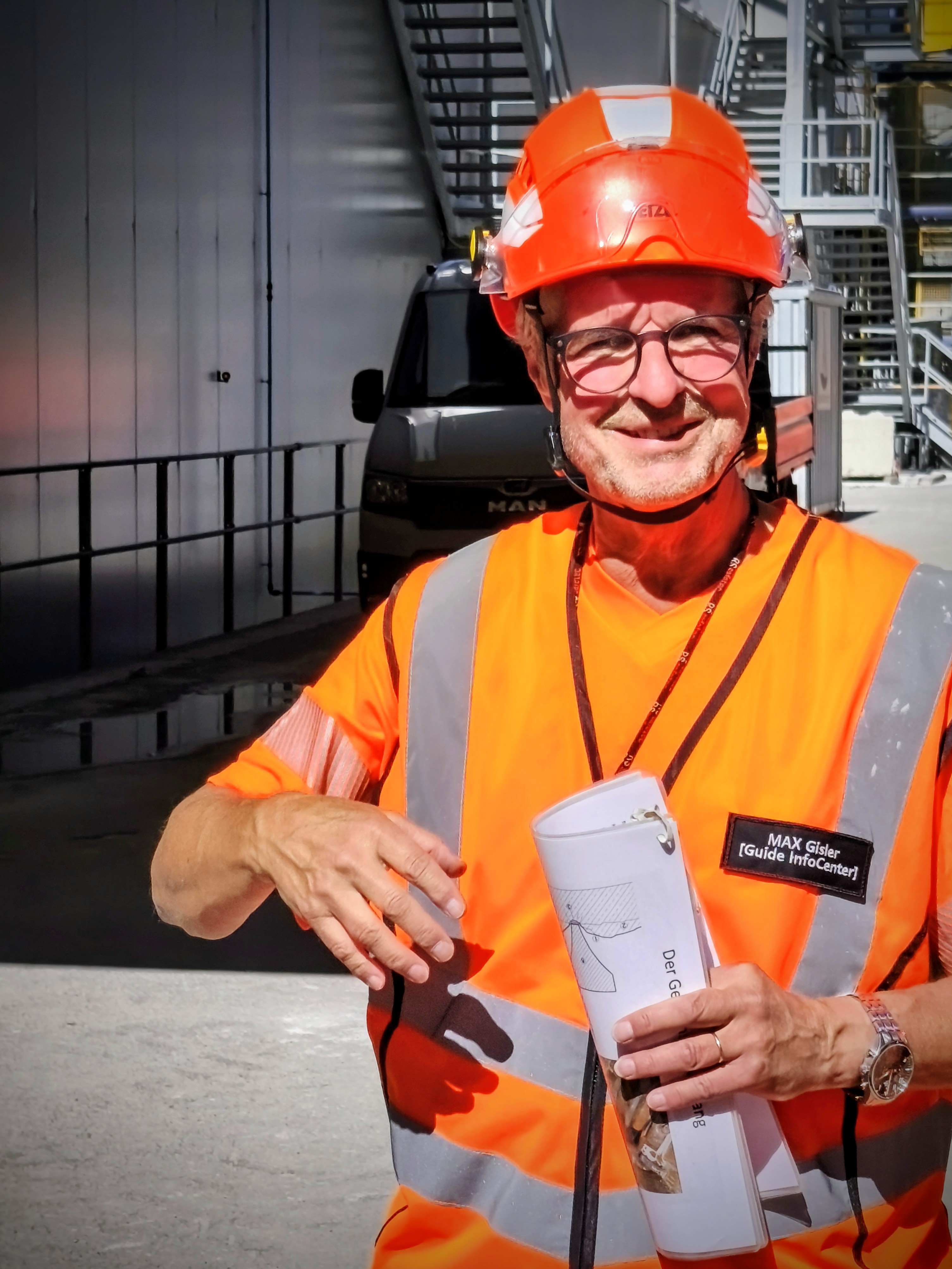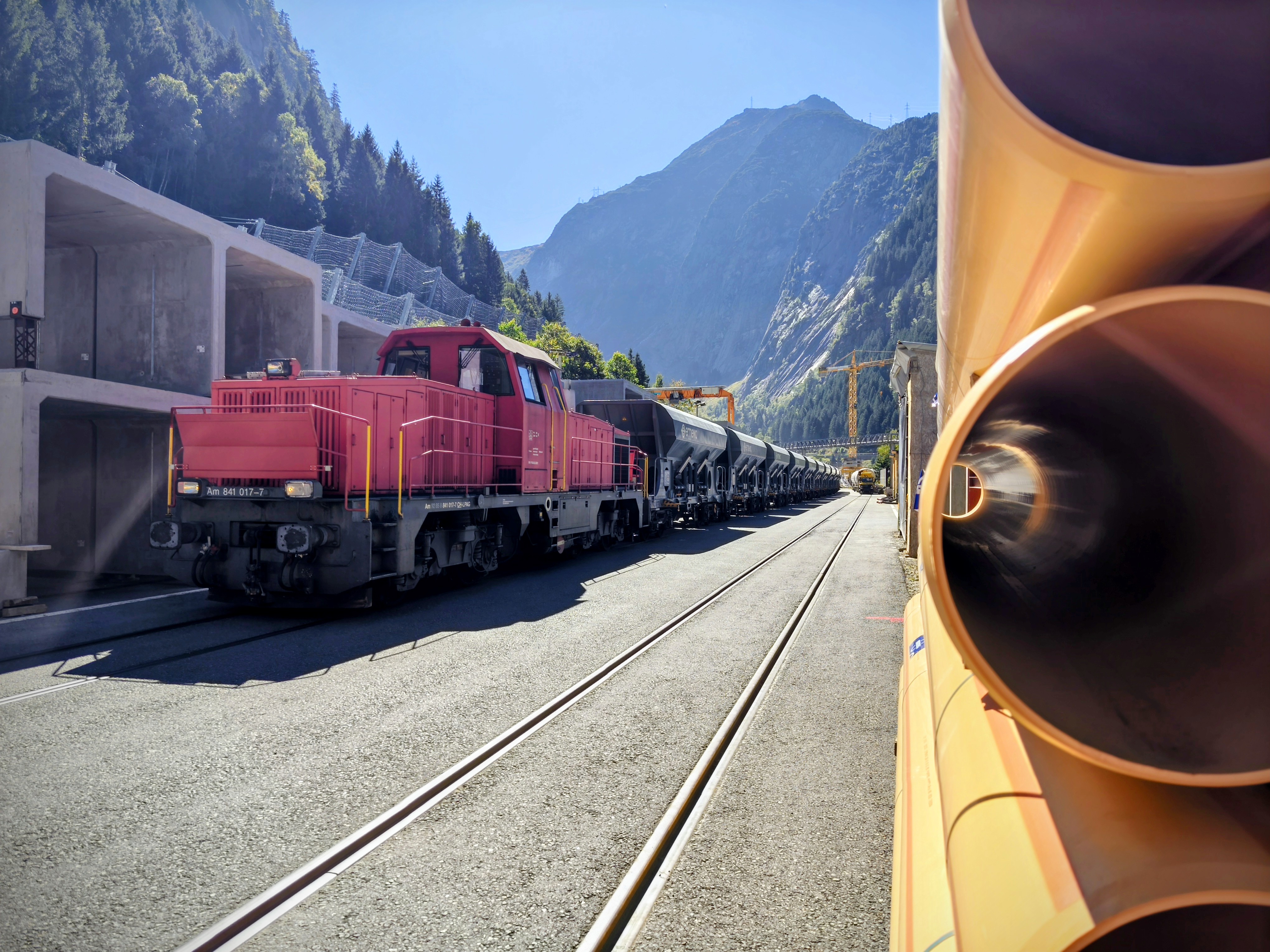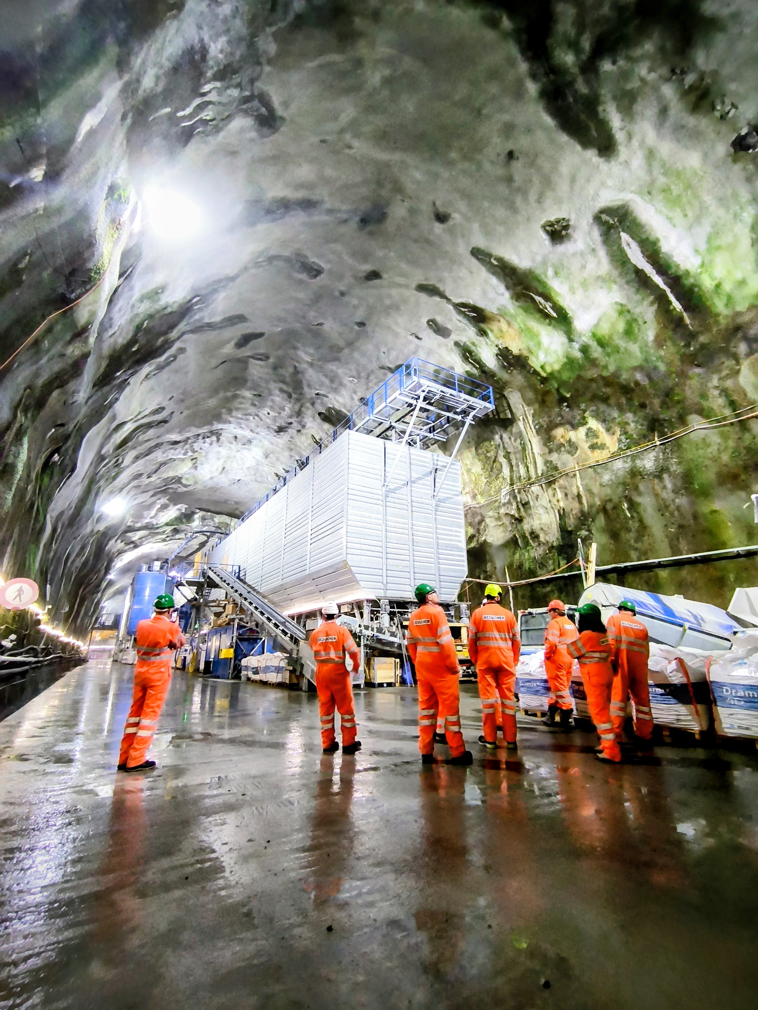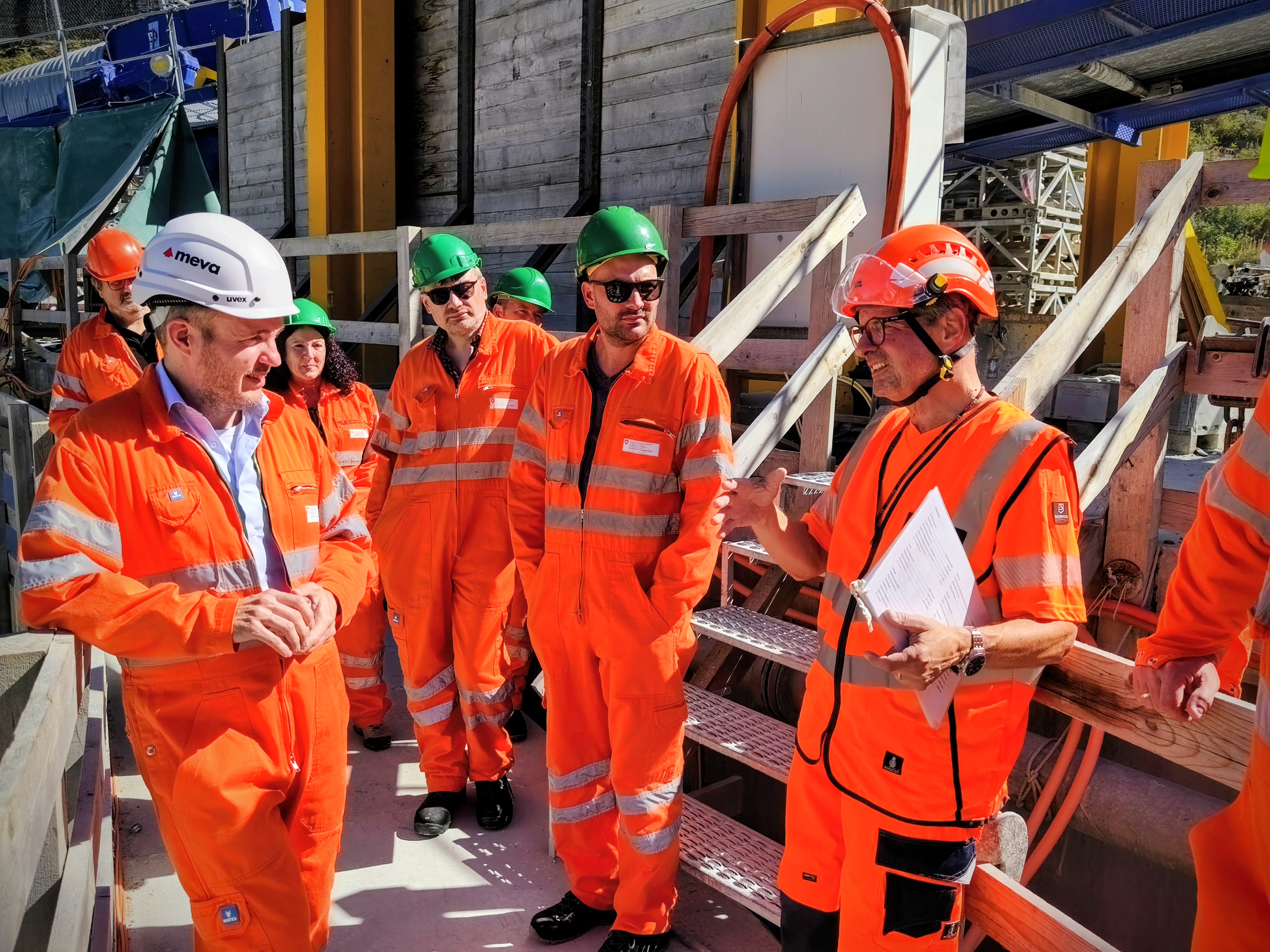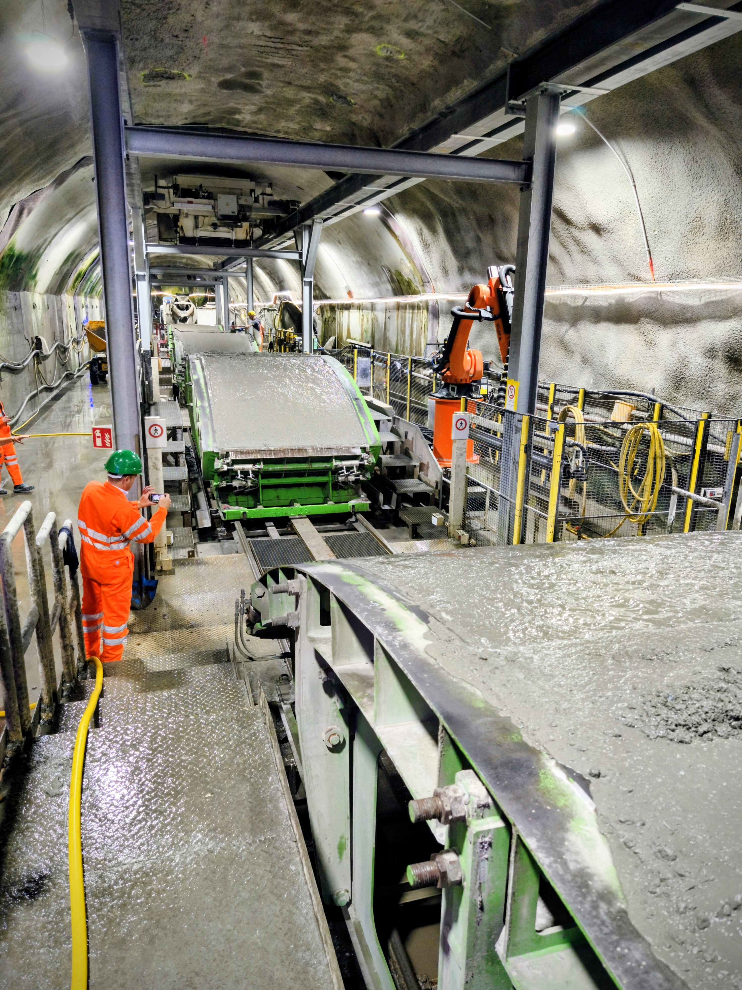 Genau in diese Kavernen geht es wenig später in vier Gruppen. Bevor wir jedoch unter Tage gehen, ziehen alle Teilnehmenden einen orangen Arbeitsoverall und einen grünen Helm an. Die Sonne brennt auf unsere Köpfe, Schweiss rinnt unter den Overalls. Durch eine Bahnhofsunterführung, vorbei an gesperrten Geleisen, betreten wir die Baustelle. Hier wird Ausbruchmaterial auf Züge verladen, ins Tessin gebracht, dort in Sand und Kies getrennt – und über denselben Weg zurücktransportiert.