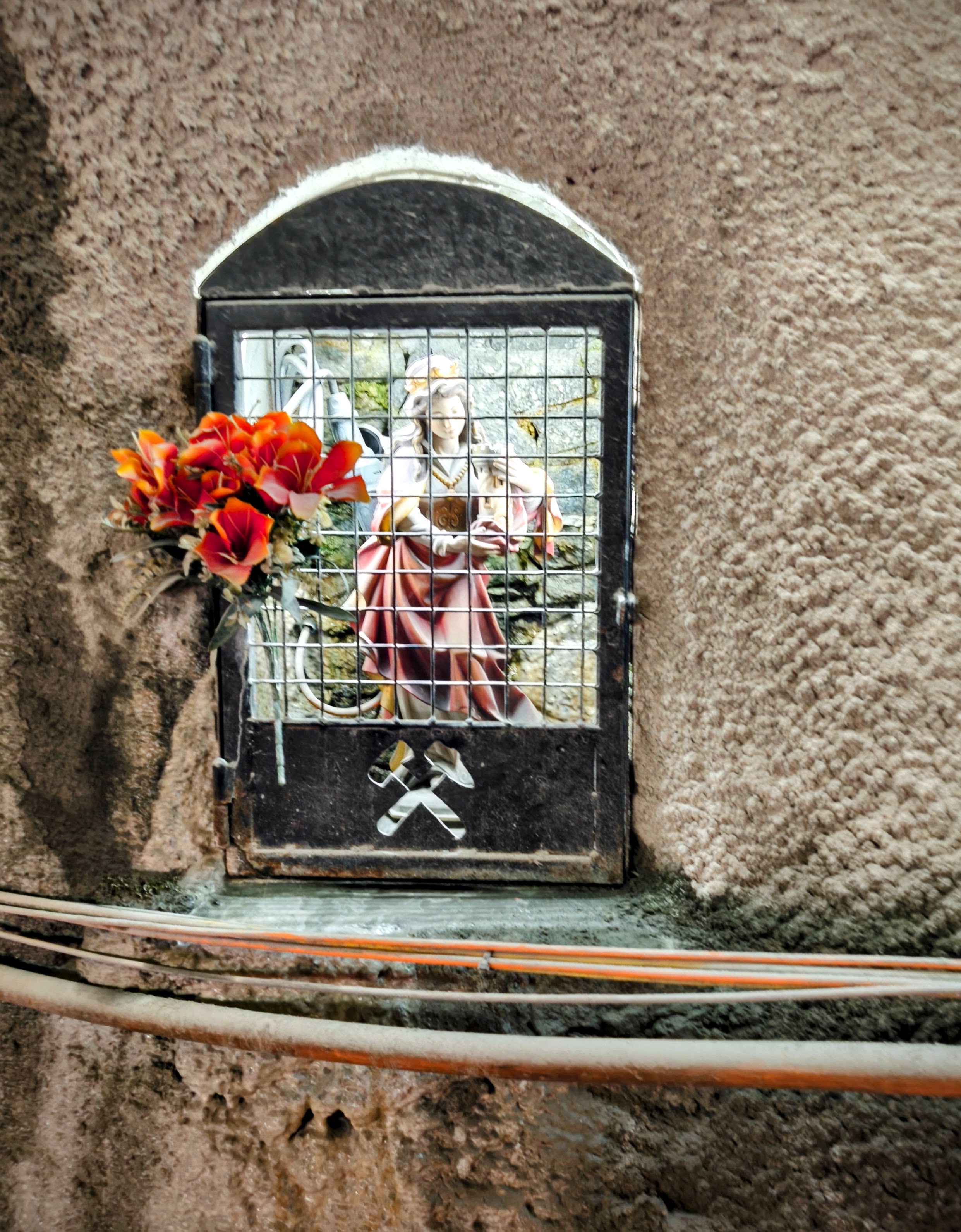 Die Besucher marschieren tiefer hinein. Die Luft ist feucht, von den Wänden tropft Wasser. An manchen Stellen wachsen Farne und Moos. Hier unten spürt man, dass der Berg lebt. Und plötzlich steht sie da: eine kleine Statue in einer Felsnische. Die Heilige Barbara. Sie wacht über die Männer im Berg, über jene, die bohren, sprengen, betonieren. Beim Bau der ersten Röhre starben 19 Arbeiter. Diesmal, sagt Charly, ist bisher noch niemand ums Leben gekommen. Dank besserer Sicherheitsvorkehrungen – und vielleicht auch dank der Schutzpatronin.