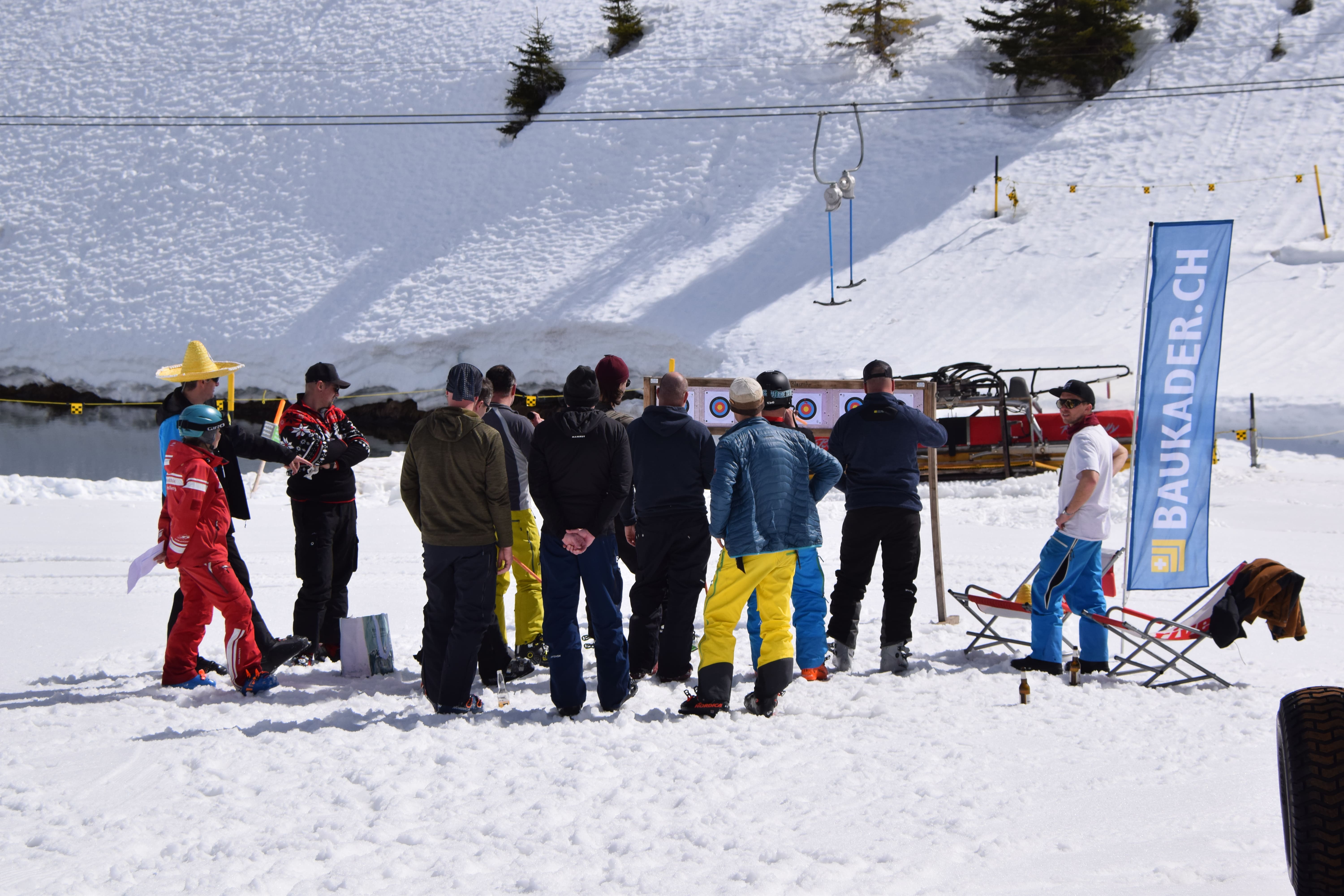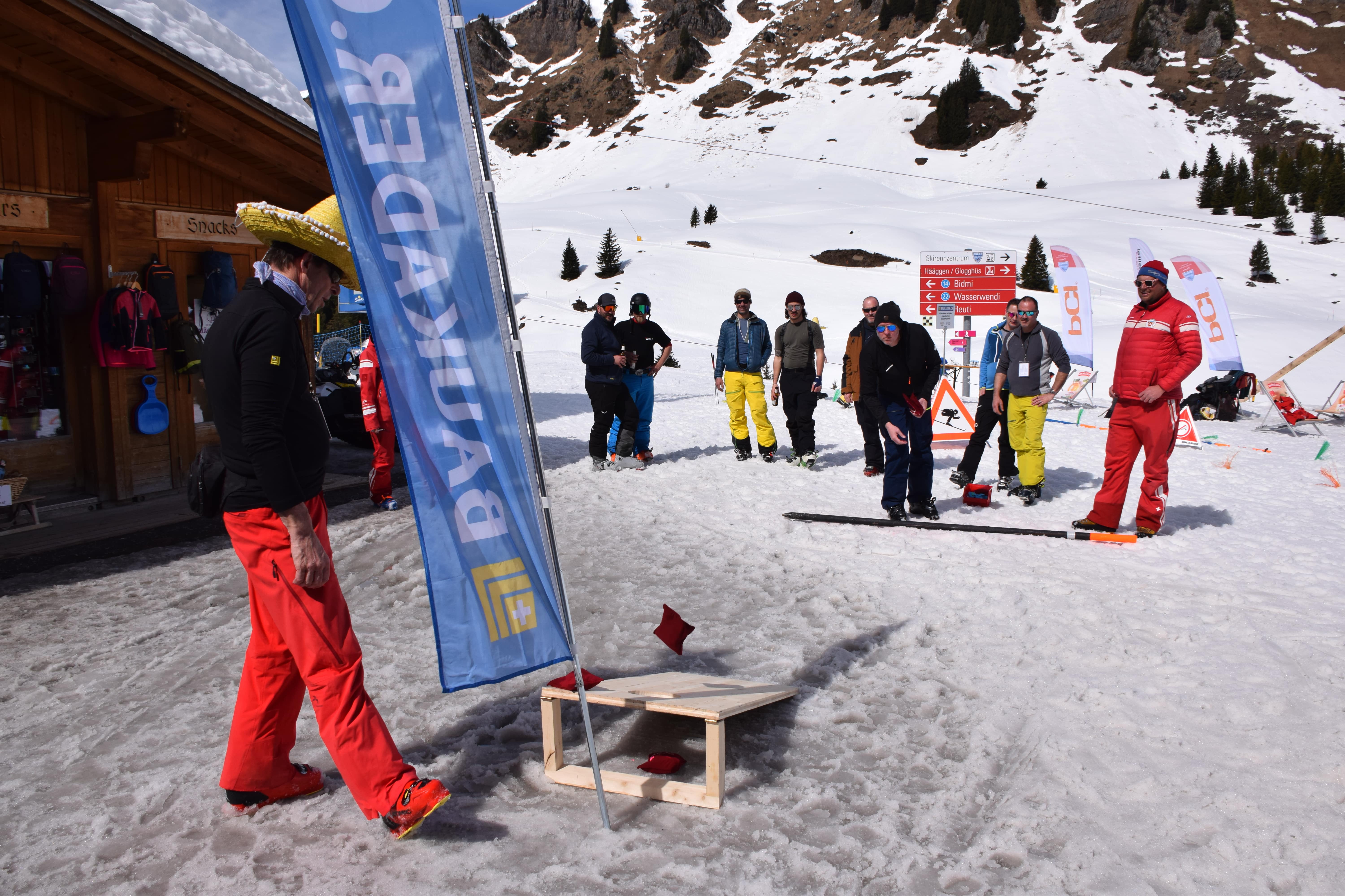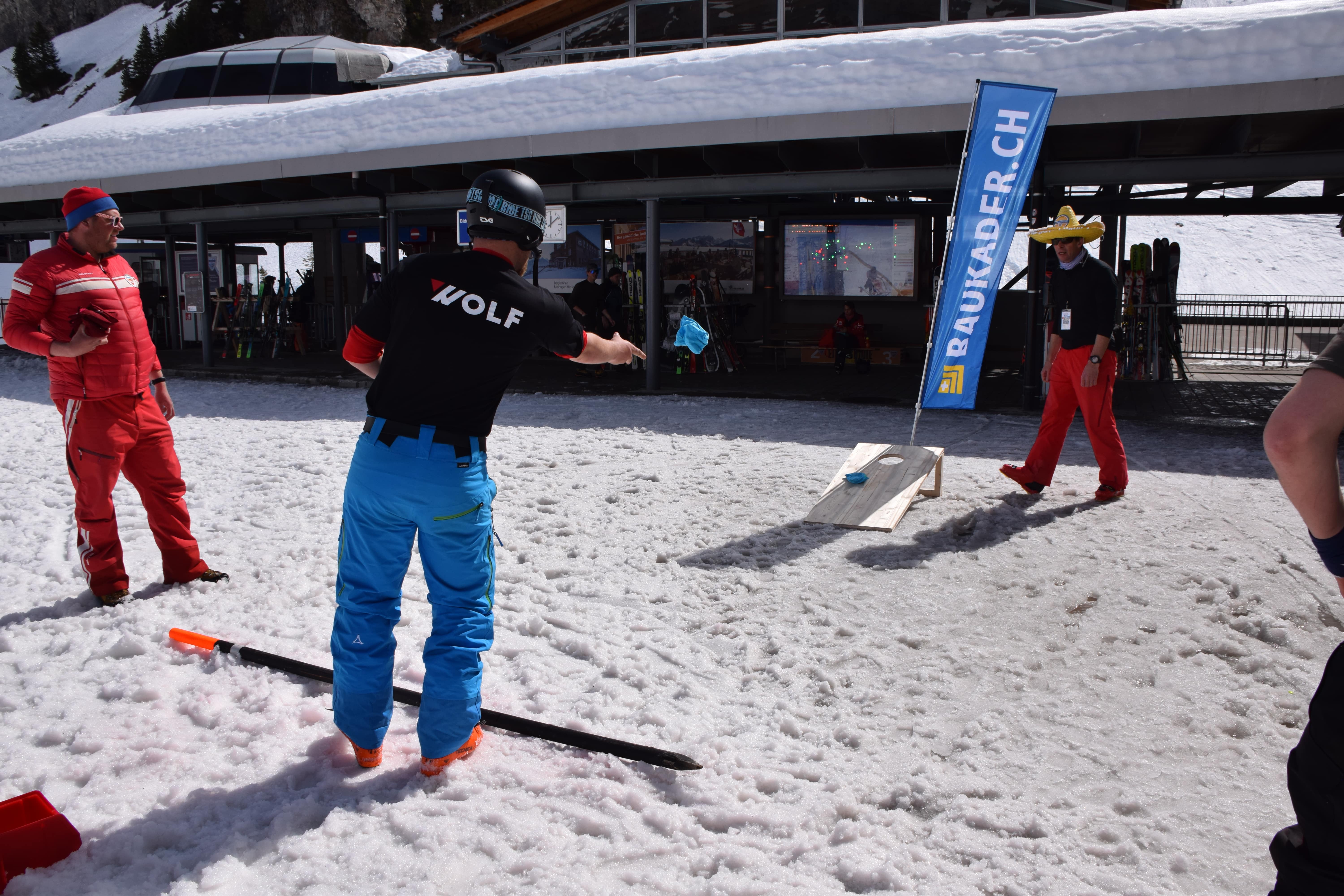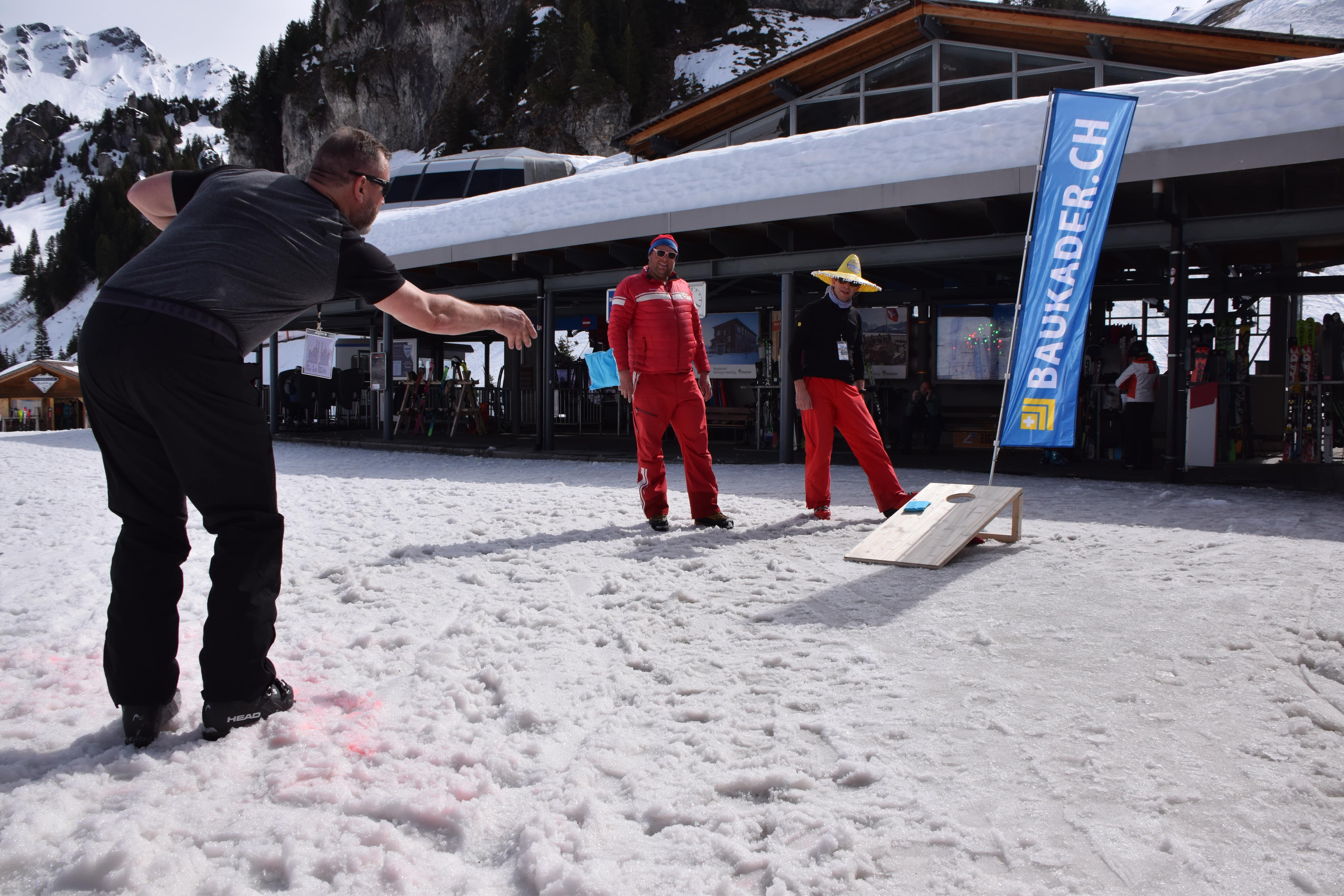 Nebst den BAUKADER Fahnen, die für den Verband Präsenz markierten, fielen die Vertreter von BAUKADER Schweiz auch mit den gelben Sombreros auf und kamen so mit zahlreichen Vertretern der Baubranche ins Gespräch. In 15 Teams waren die 200 Teilnehmer mit einem eigenen Skilehrer auf dem Hasliberg unterwegs und erkundeten das Skigebiet, bevor sie zwischen 11 und 14 Uhr zum Plausch-Spiel-Event eintrafen. Bei Schnee-Minigolf, Blasrohr-Schiessen und Cornhole-Werfen wurde viel gelacht, neue Bekanntschaften geschlossen und um den Gruppensieg gewetteifert.